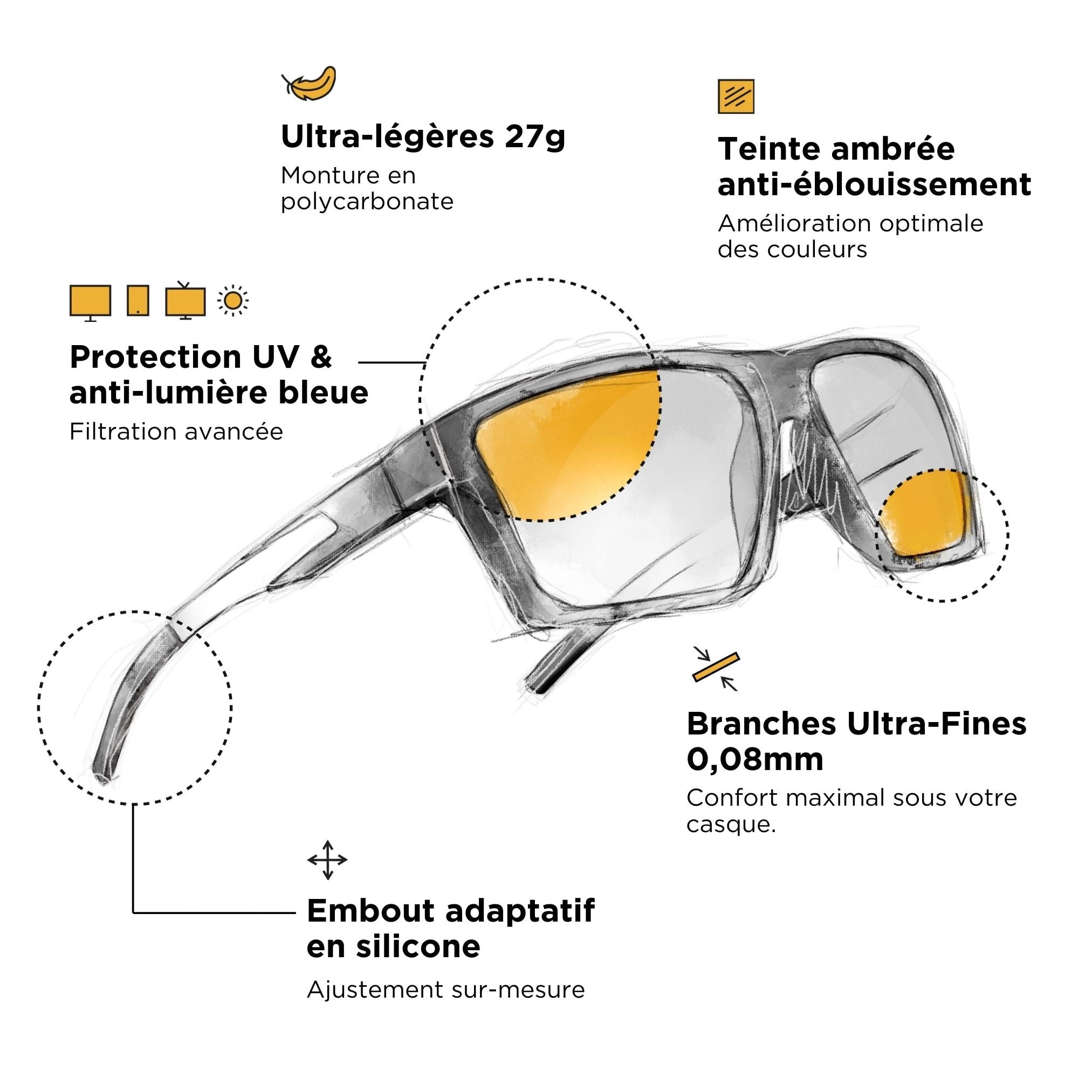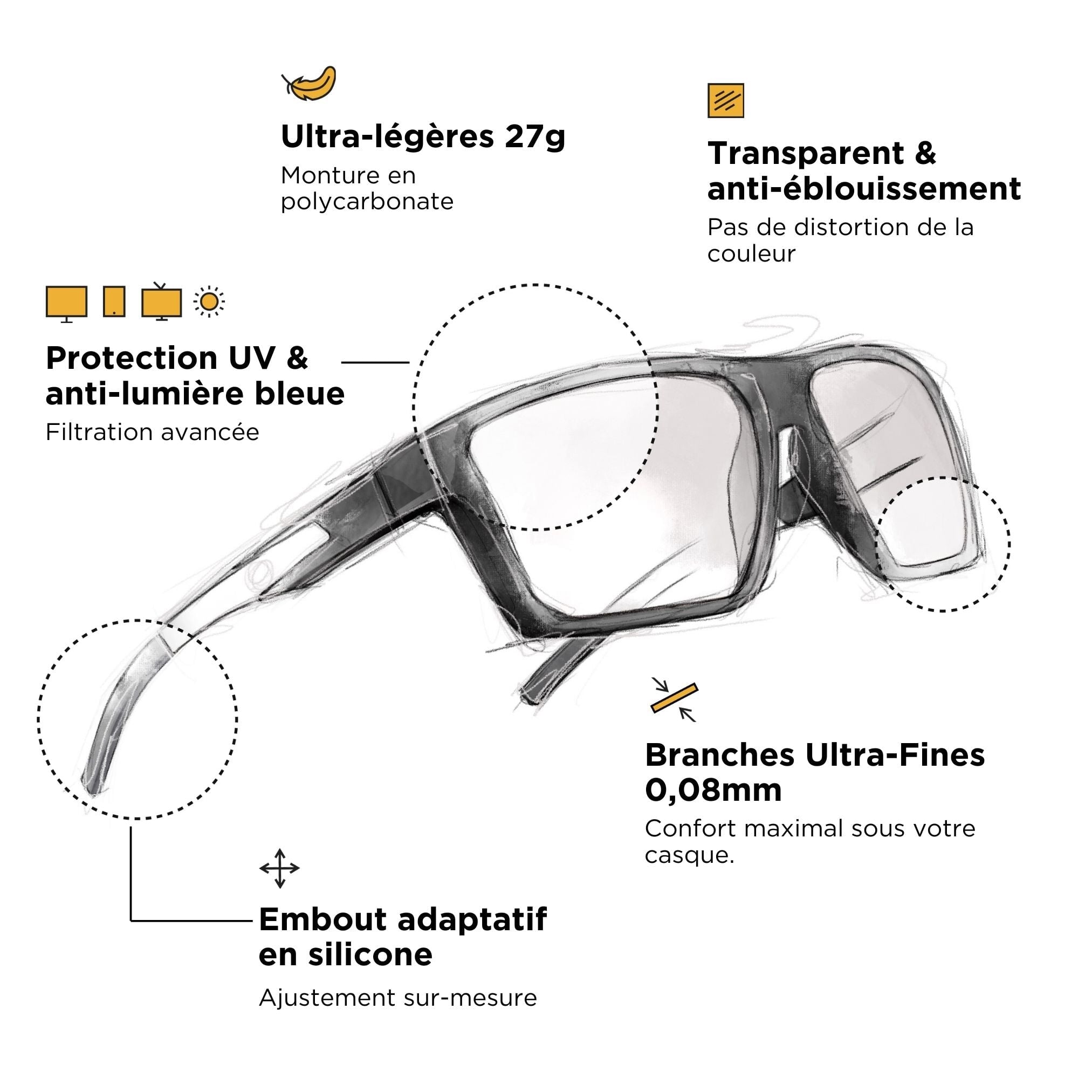 Superleichter Rahmen aus Metall und Polycarbonat, ultraweich dank unserer Soft-Protect-Beschichtung, ergonomisches und komfortables NosePad, ultradünne Bügel... Ultimativer Komfort, optimiert für das Tragen eines Headsets. Diese Brille gerät in Vergessenheit, damit du dich auf deine Leistung konzentrieren kannst.