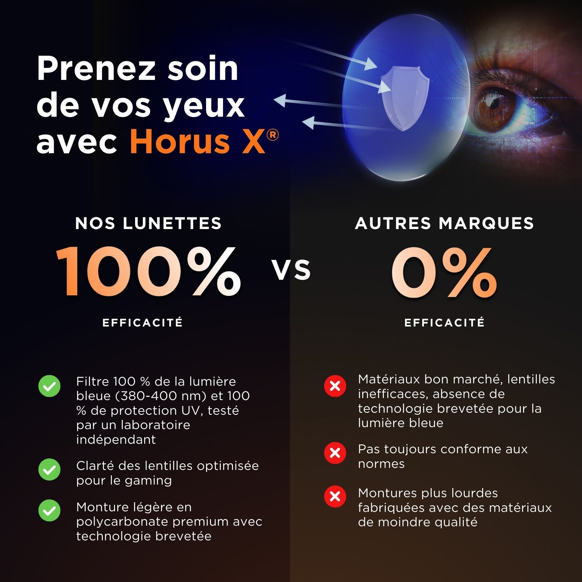Unglaublicher 100%iger Schutz vor blauem Licht bei 400nm + 86% auf das erweiterte schädliche Spektrum des blauen Lichts. Das Beste der Horus X-Filtertechnologie in unserer stylischsten und komfortabelsten Gaming-Brille, um den schädlichen Auswirkungen von Bildschirmen ein Ende zu setzen. Verliere nie wieder ein Spiel wegen eines Pings von 200ms.