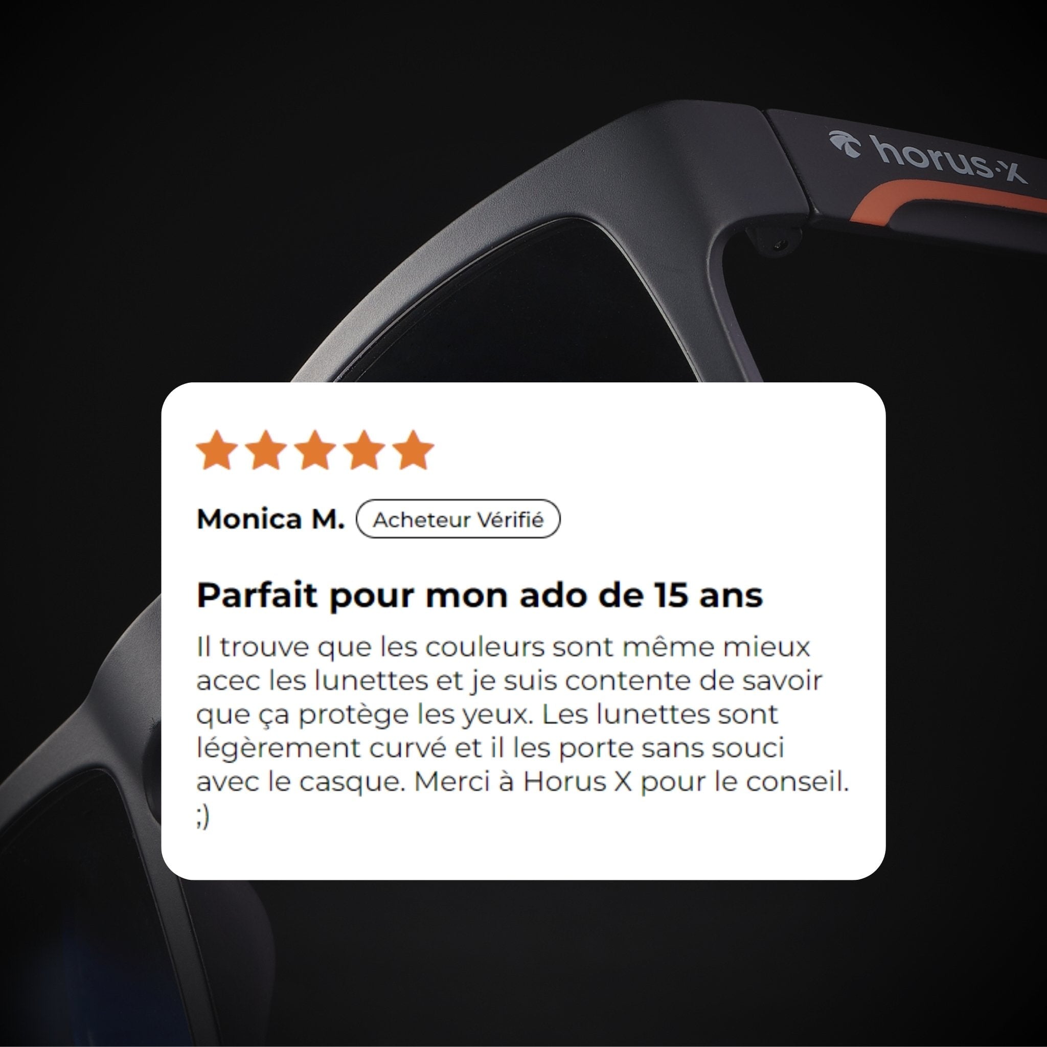 Nous avons travaillé très dur pour équiper nos lunettes gaming Horus X Hope des meilleurs matériaux. Branches et verres en polycarbonate Japonais, matériau ultra léger (20g!), doux & hypoallergénique. Un confort inégalé pour des heures de jeux, optimisé pour le port du casque.
